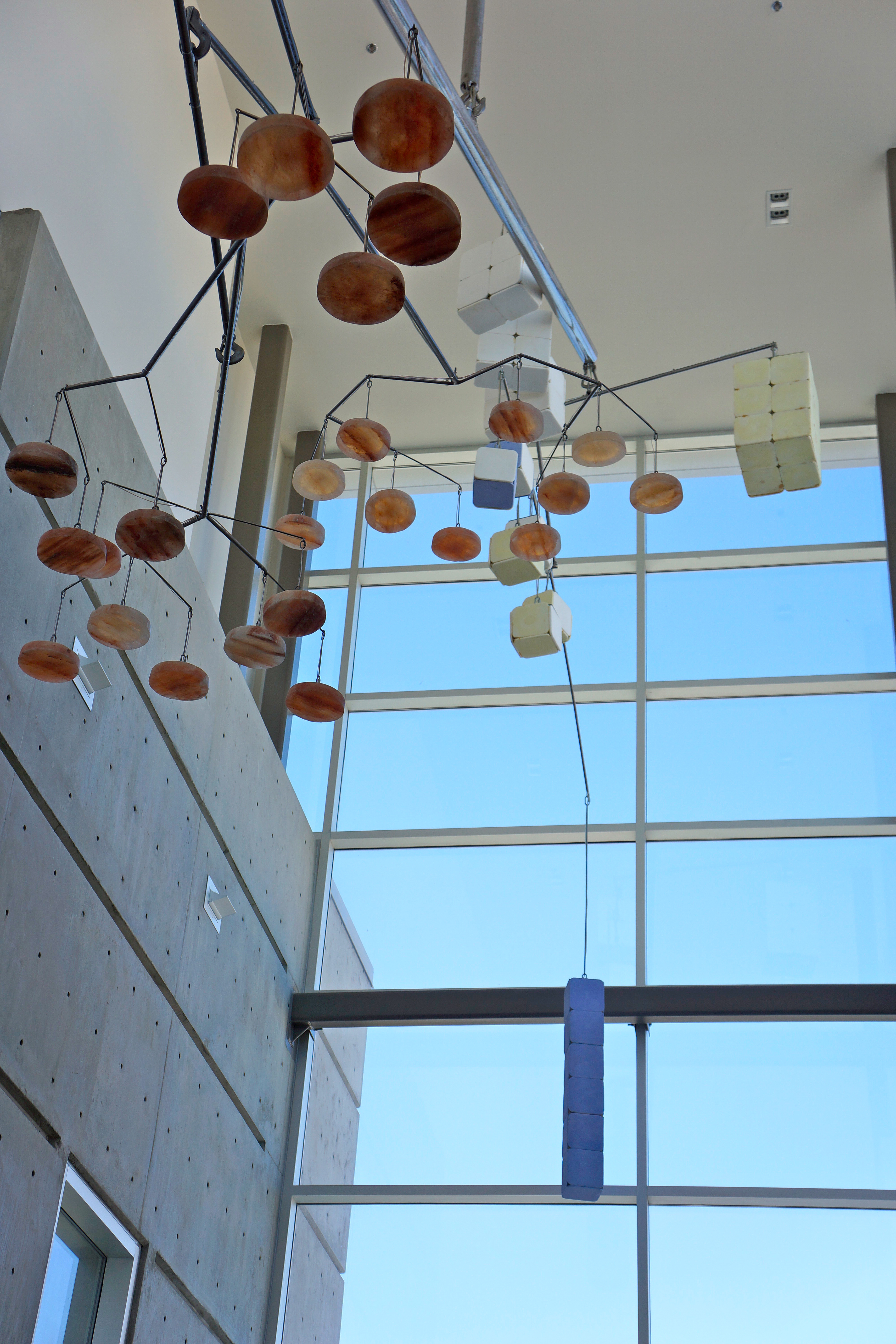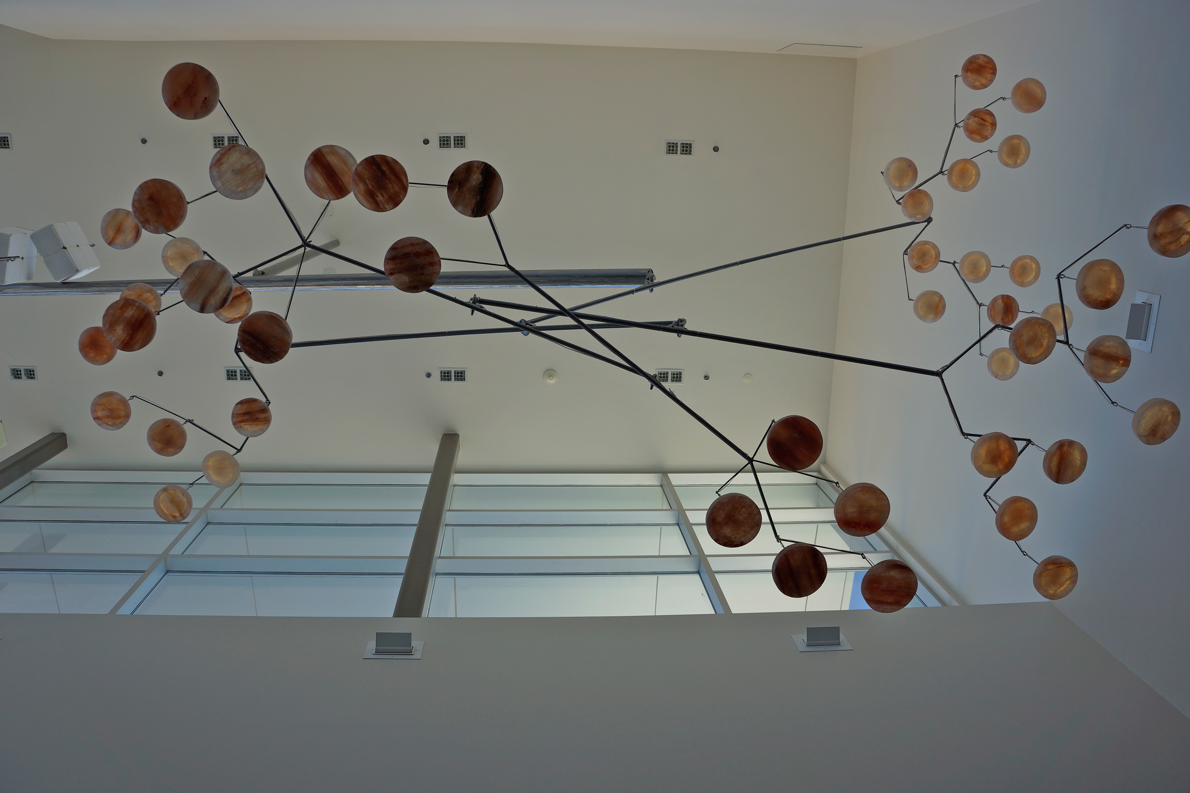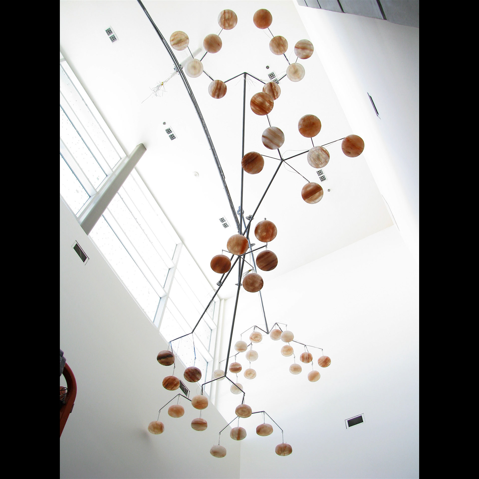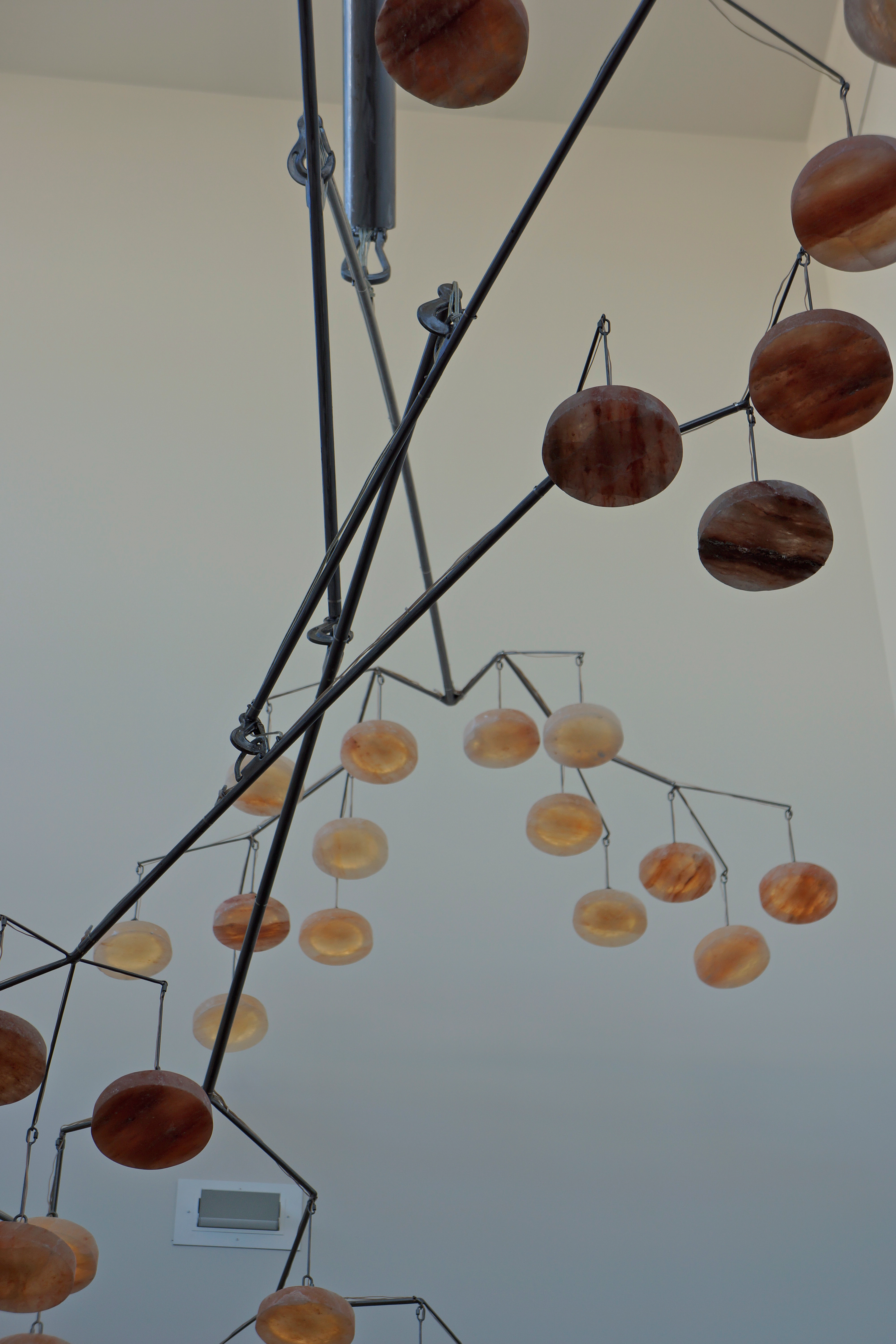 To see the structure of the mobile: first find the drop-pole descending from the ceiling; next see the trans-pole suspended from the drop pole; at the far side of the trans-pole hangs the grouping of yellow, white, and blue salt block (hollow and illuminated from within at night), directly above is the 4 layered drop of Himalayan sand-stone disks (with inlayed led for night illumination). All forms hang in counterbalance to eachother.