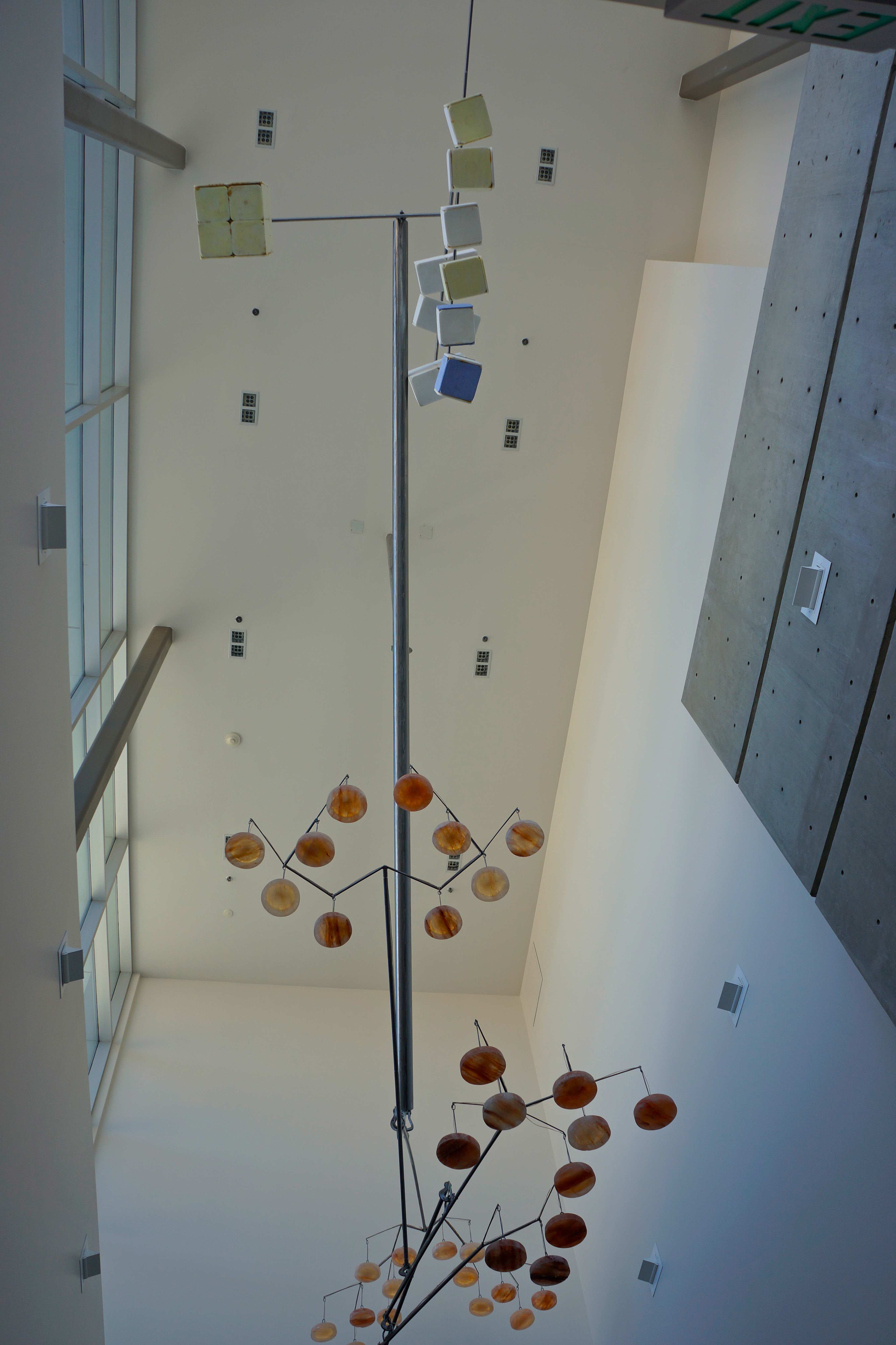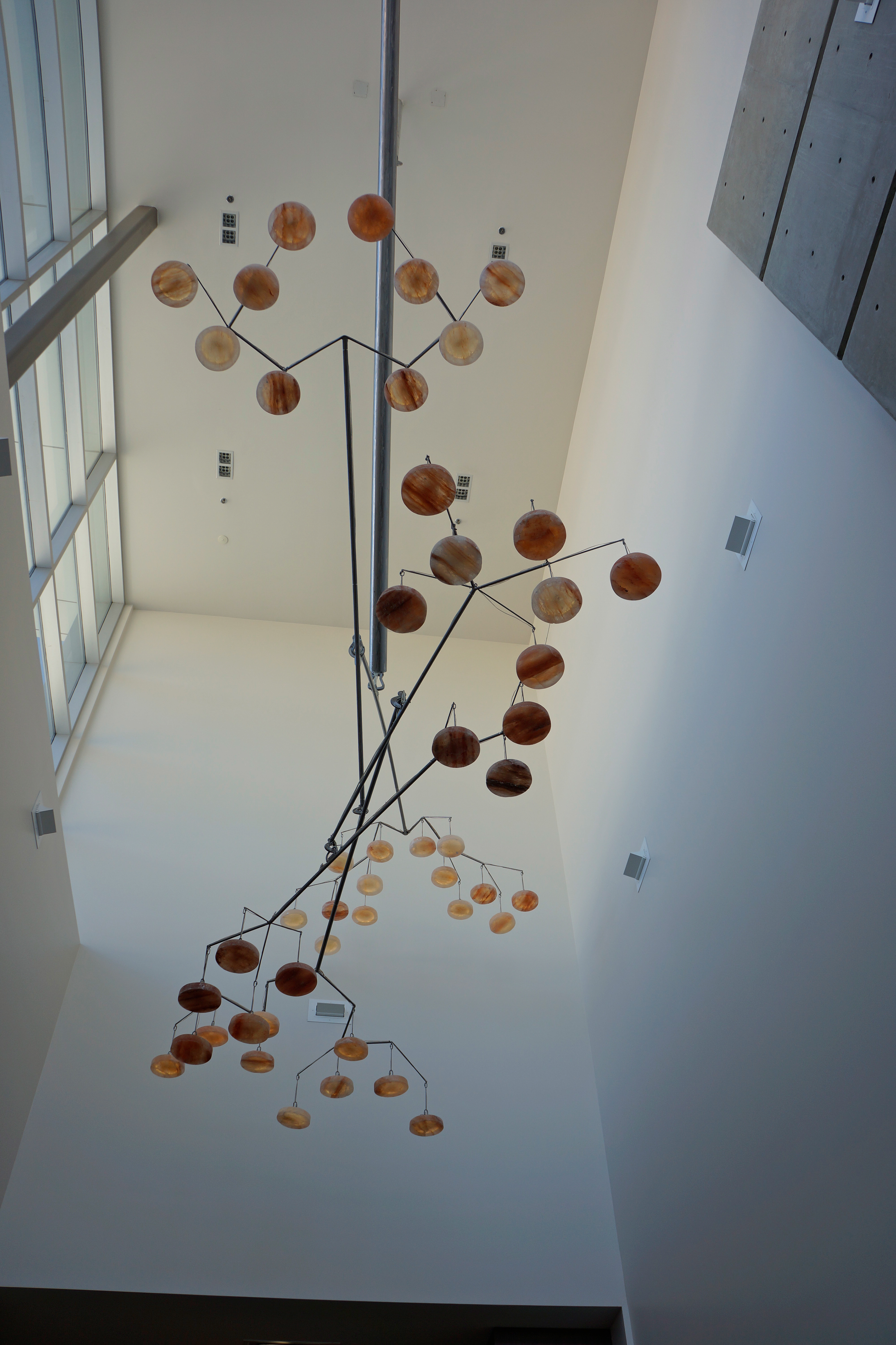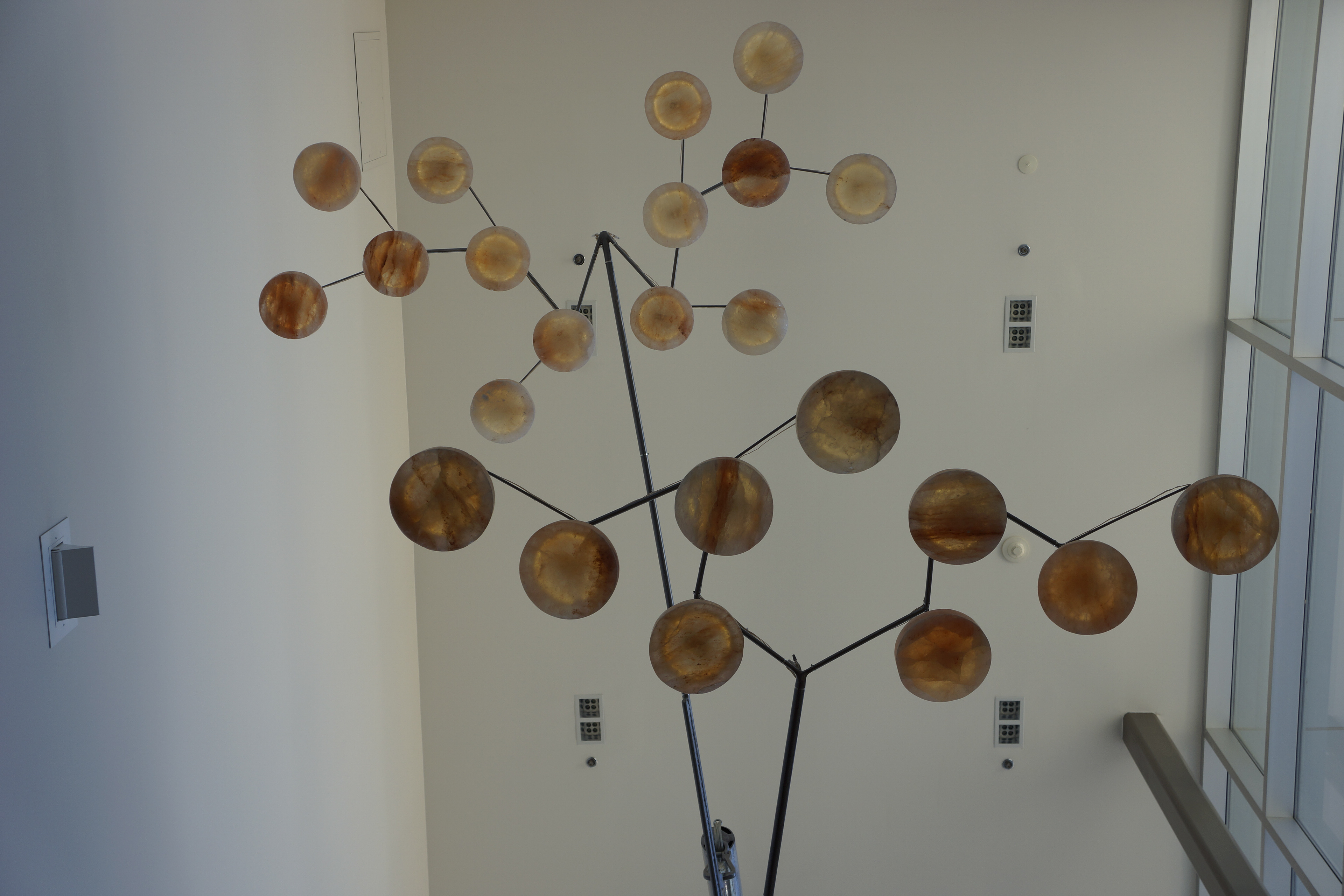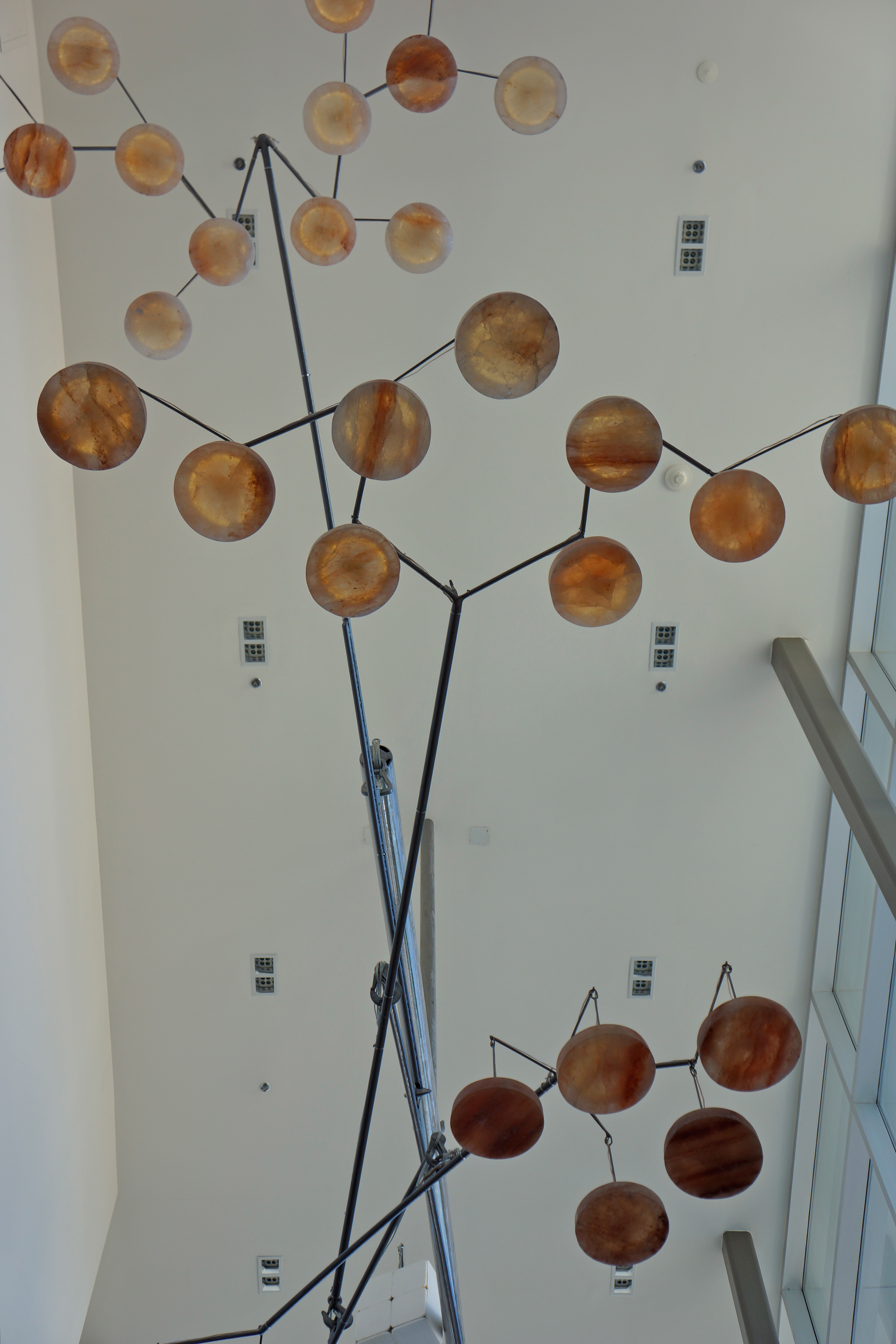 To see the structure of the mobile: first find the drop-pole descending from the ceiling; next see the trans-pole suspended from the drop pole; at the far side of the trans-pole hangs the grouping of yellow, white, and blue salt block (hollow and illuminated from within at night), directly above is the 4 layered drop of Himalayan sand-stone disks (with inlayed led for night illumination). All forms hang in counterbalance to eachother.