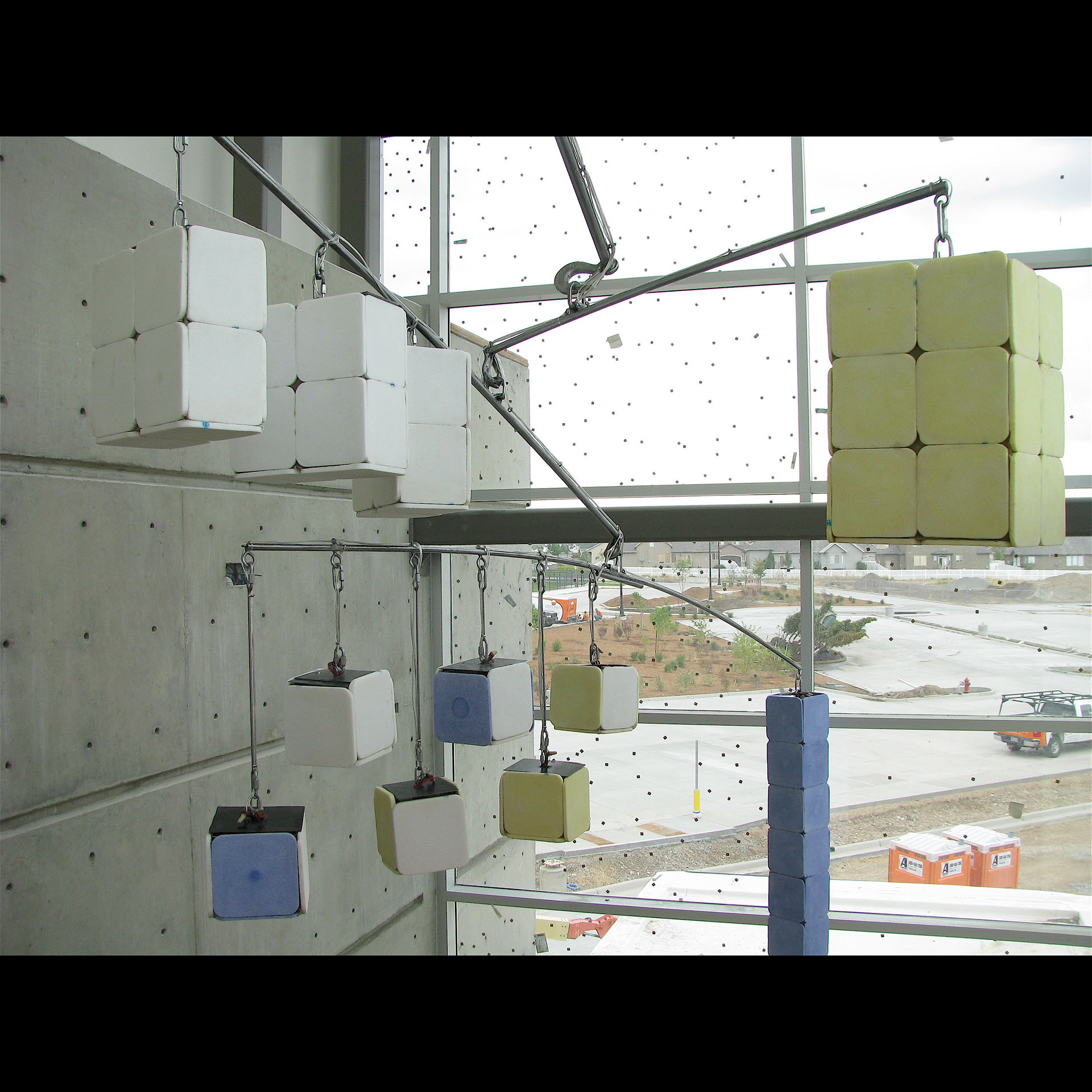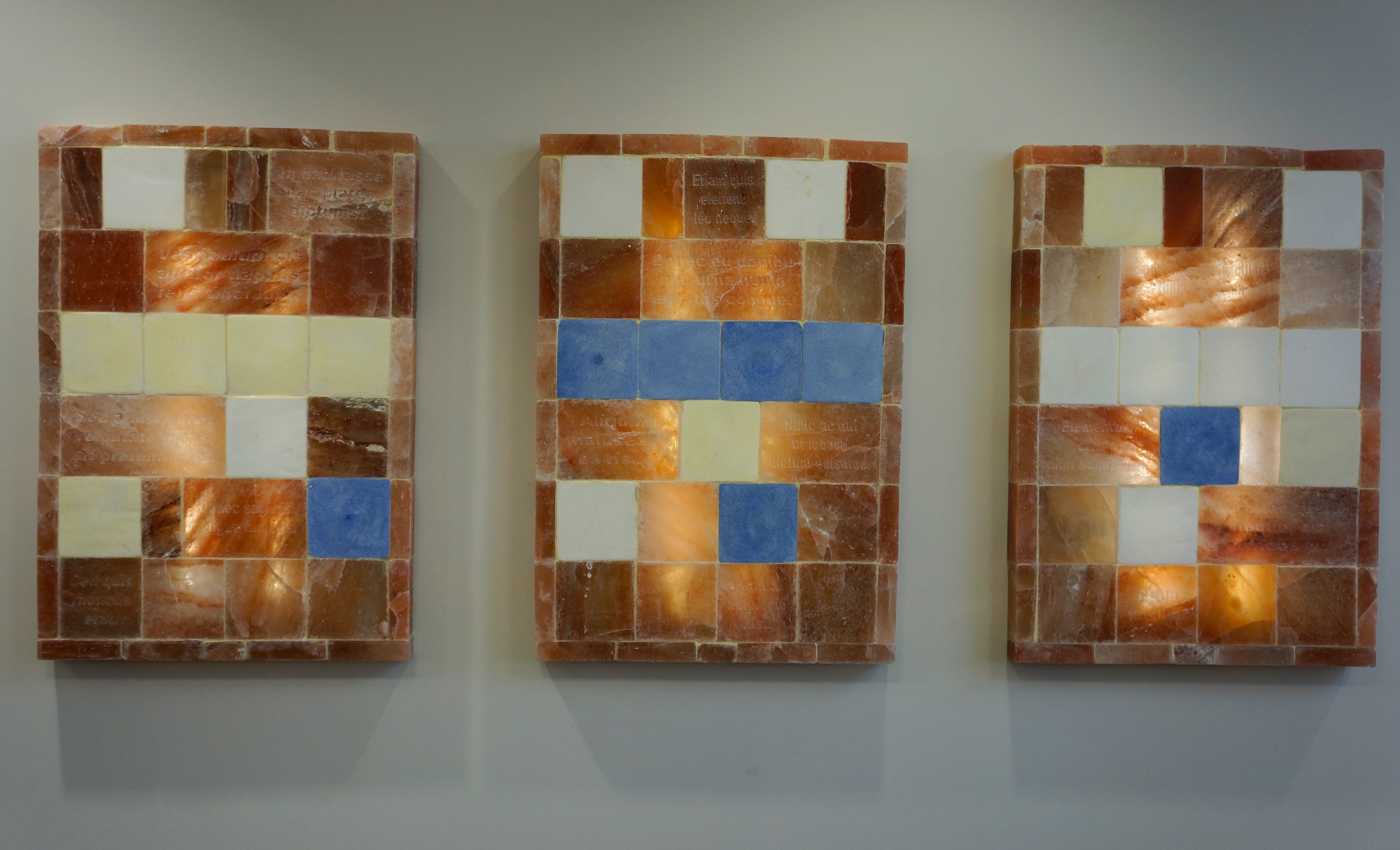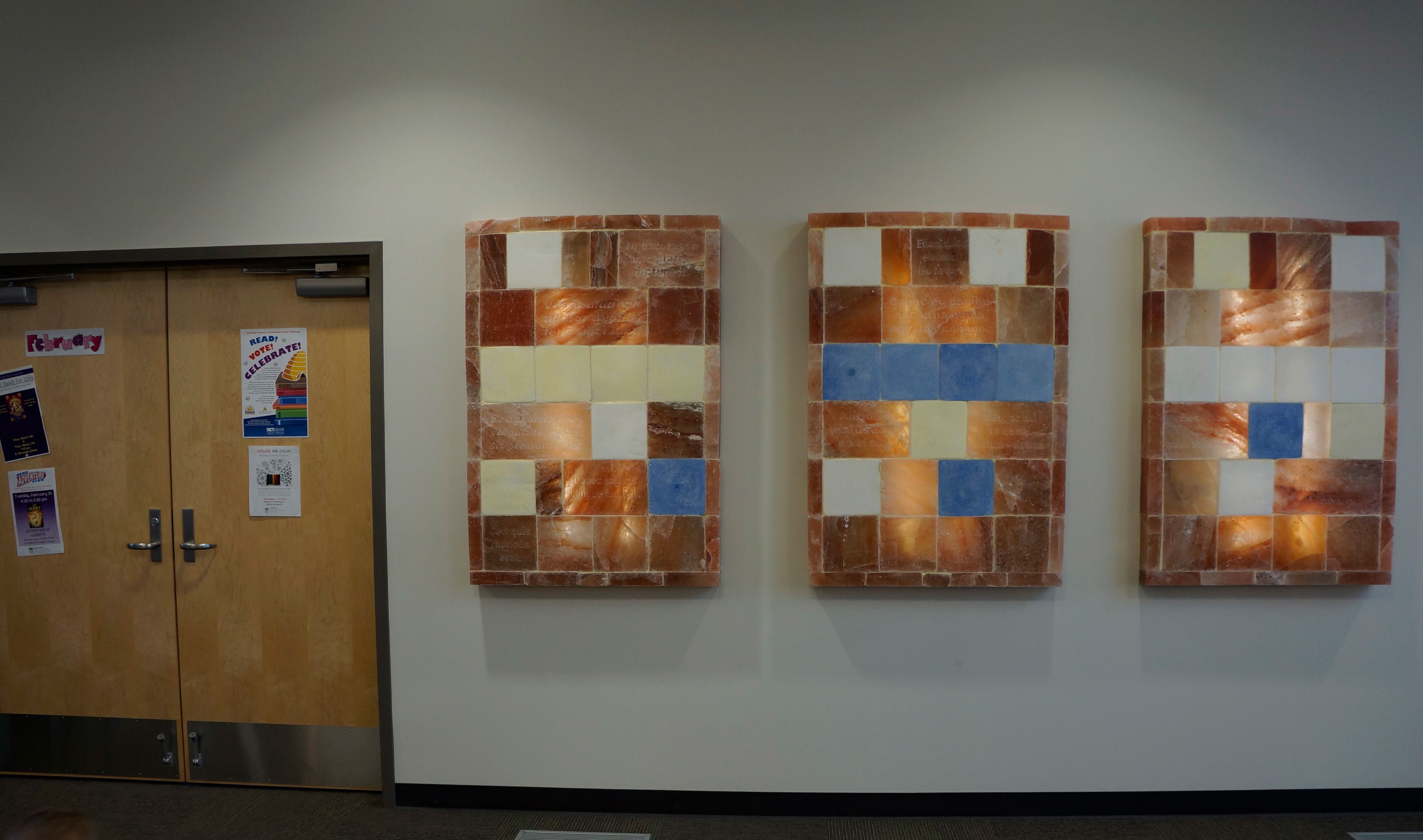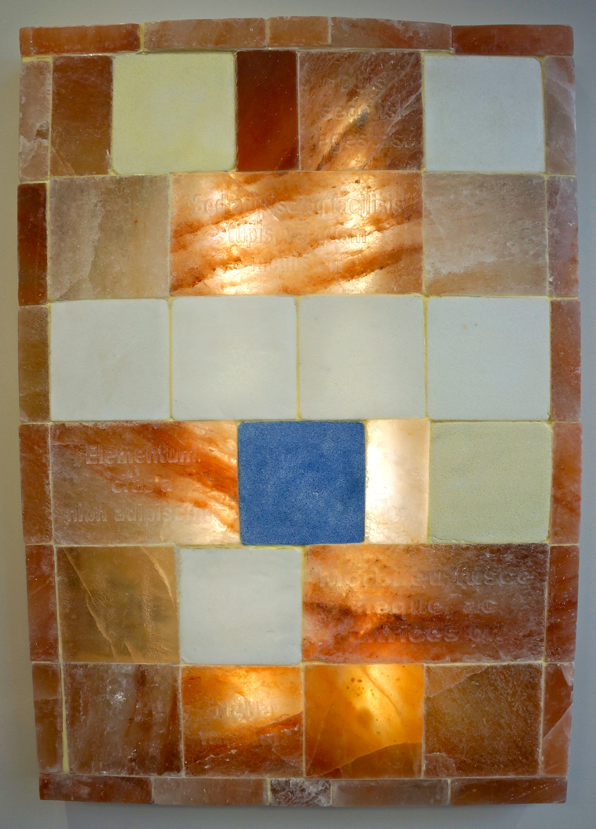 A monumental mobile in the Herriman library atrium: Weight in Salt; created from steel, salt block, and salt stone with inlaid LED programmable lights (35’x15’x25’), and a triptych series of three wall hanging forms: What Is The Meaning Of Words Without Meaning?; created from salt, with inscribed text, and internal LED lighting (3.5’x 4’ x4” ea).
