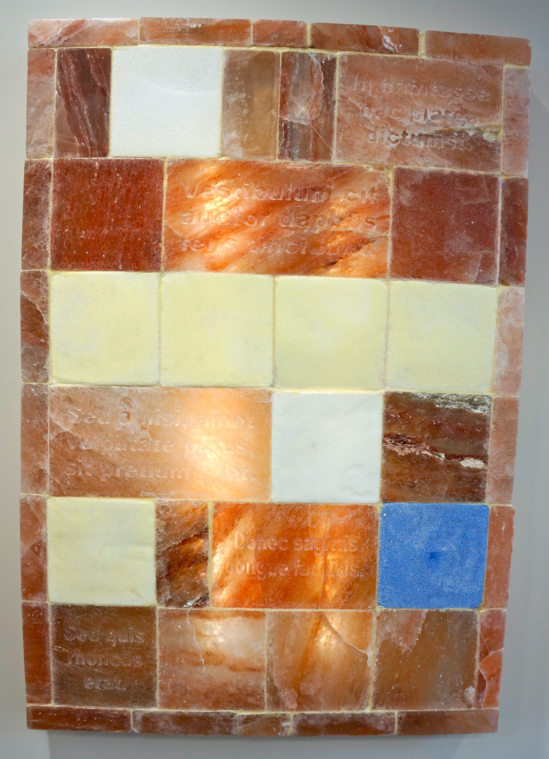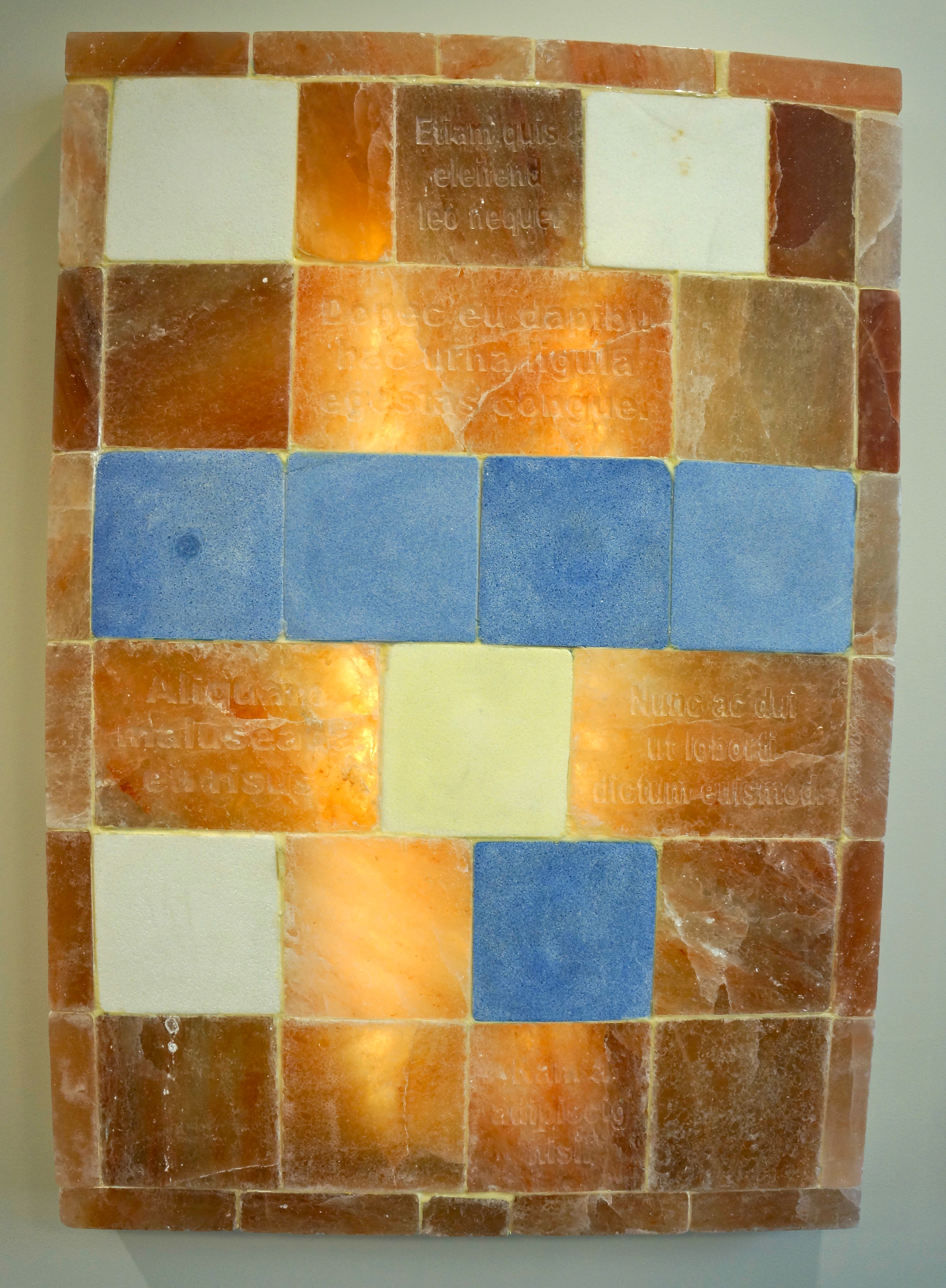 The scale is massive, with the group spanning 12' at 4' in height. Each element is 3.5' long, 4' tall', and 4 inches deep. They are hung seamlessly to the wall and the internal lighting runs on a program fading them in and out in a seemingly random sequence. If you look carefully you can make out the Lorem Ipsum nonsense words cut into the salt stone.