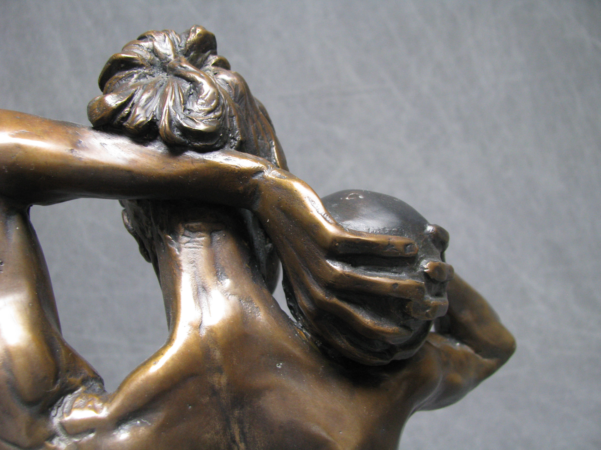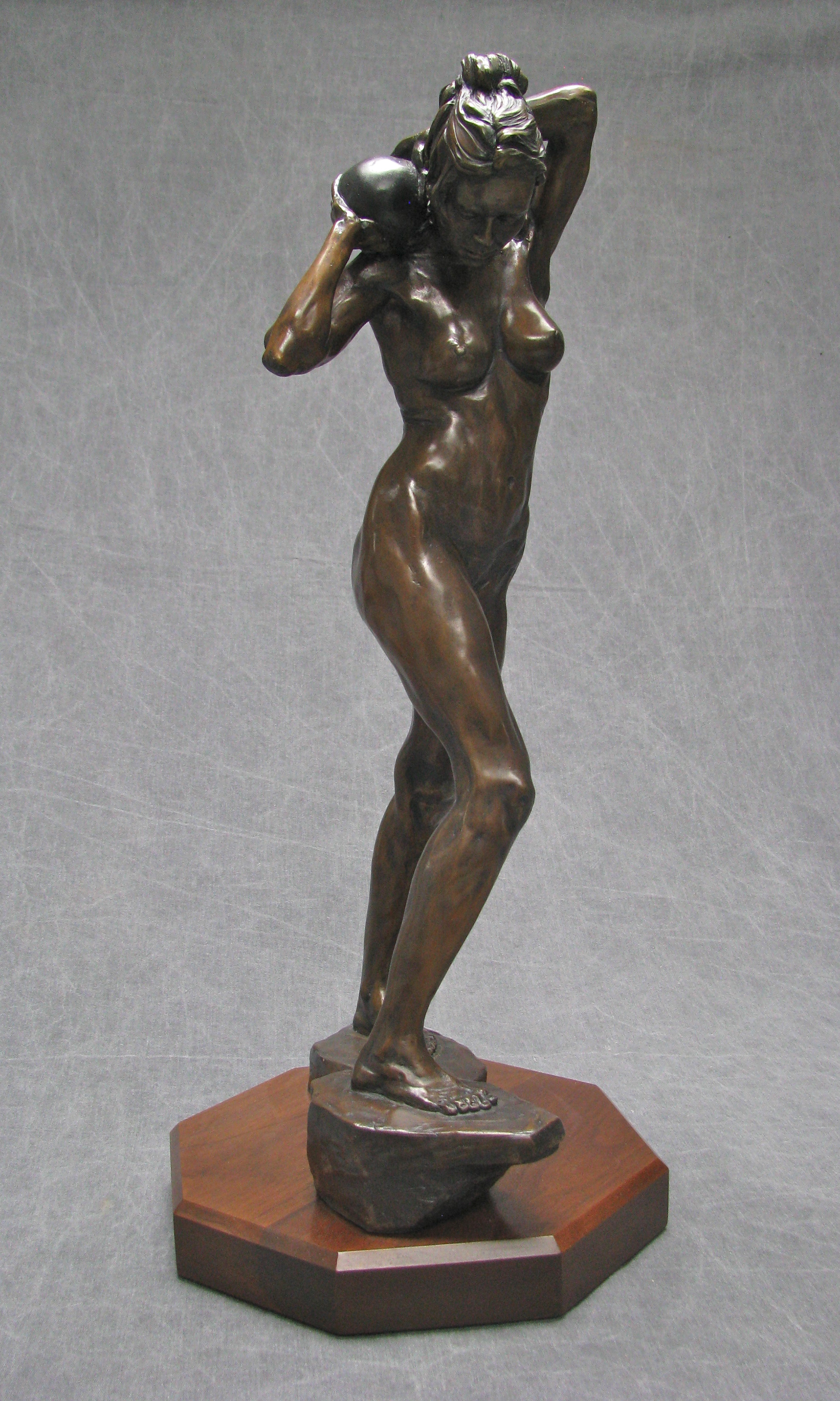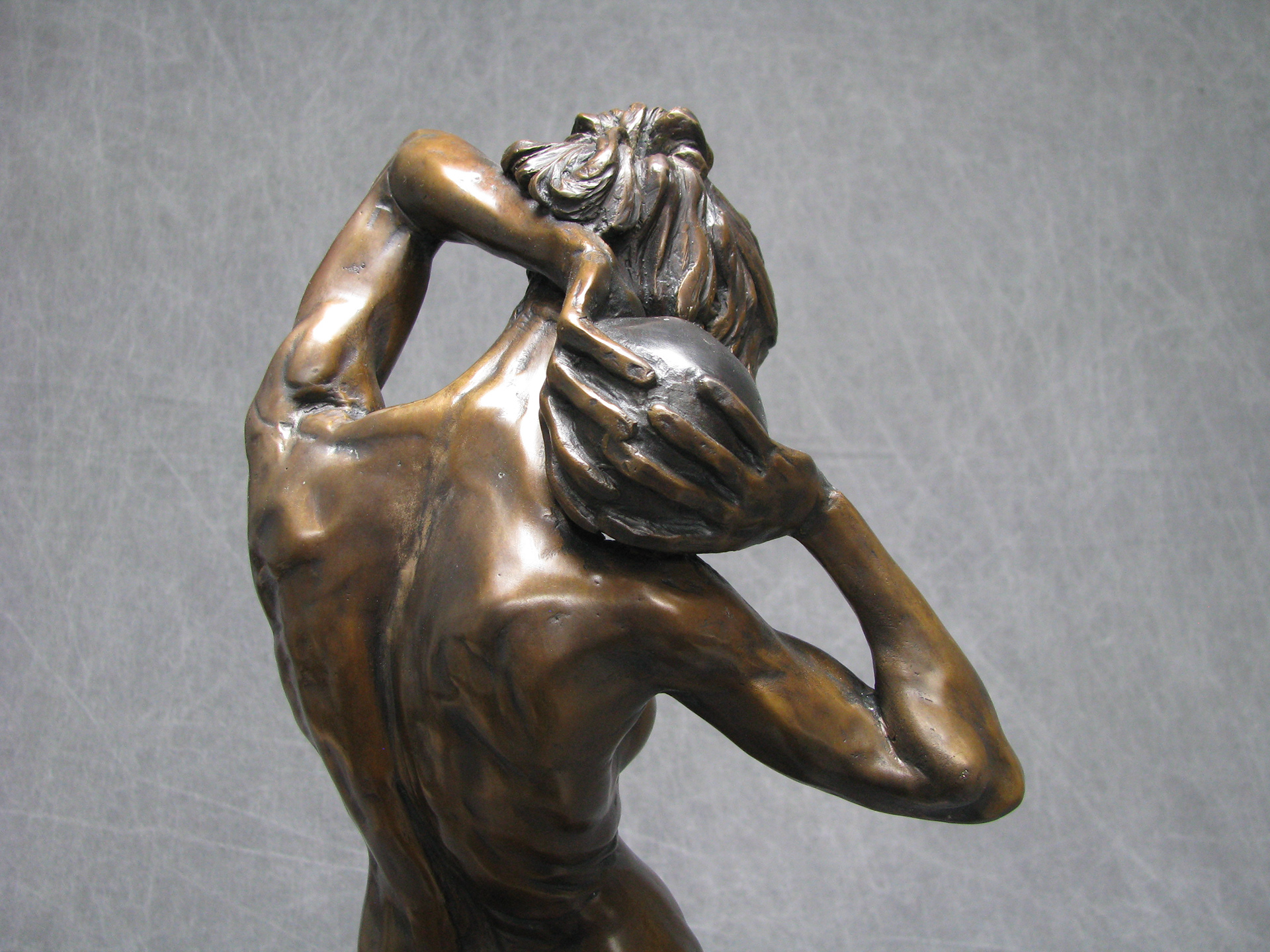 Figurative bronze female nude figure at 1/3 life size, holding weighted ball on her right shoulder.