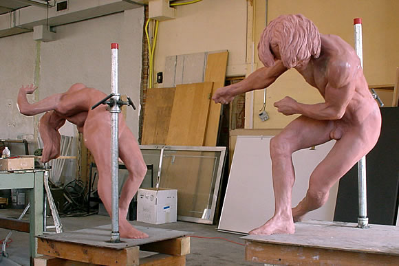 My MFA exhibition, coupled with my rapport with the art history department and in turn the curator of modern art at the Utah Museum of Fine Art, led to a private commission with the state's most notable arts family, (who had just built the new Utah Museum of Fine Art on the University campus next to the fine arts department); a commission for the new Utah Symphony & Opera Production Center of my proposed idea of Orpheus and Eurydice. Because of the prestige of the donor, I was allowed one semester to cast at the University facility, as long as my studio was off-campus. The architect creating the new building offered me studio space in a vacant bay of an old one-story brick complex he owned. I sculpted the 2/3 life-size figures there, and pulled the molds and waxes. At University I used the archaic Investment-Mold casting process, then weld (with a lovely new industrial-grade beast I had bought to thank the department), chase, and patina, with an additional large abstraction built from the figures and two partial figures for a fountain. The donor commissioned an additional pair of the Orpheus and Eurydice figures for the foundation collection. All the figures followed my MFA aesthetic, of a unique casting process unobtainable by modern casting methods, that results in significant random and uncontrolled flashing across the surface of the figure, among other process marks.