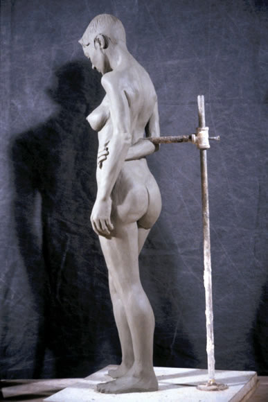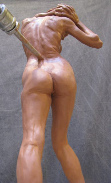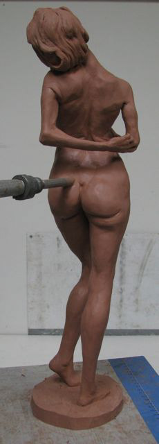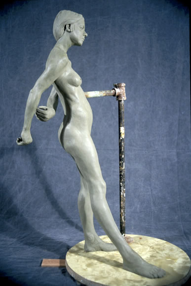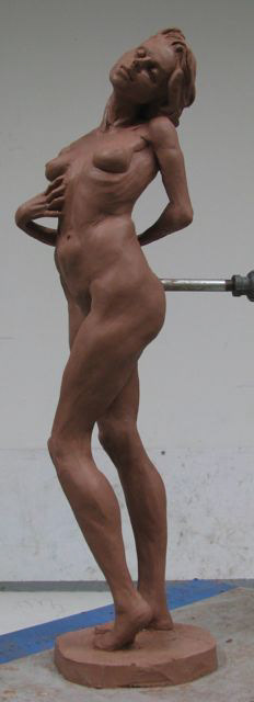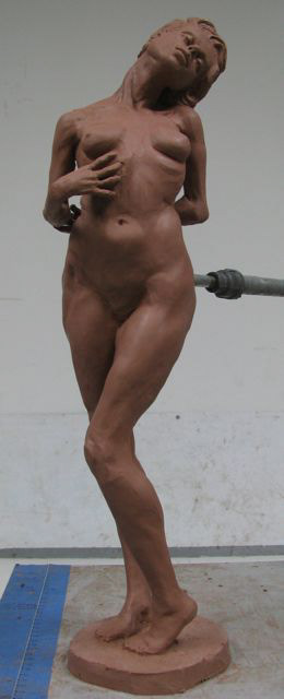 This is a 1/3 life size sculpture from the live model, finished January 2014. She holds a heavy ball and stands with feet at different heights while twisting pushing structural issues of dynamic skeletal-musculature systems.