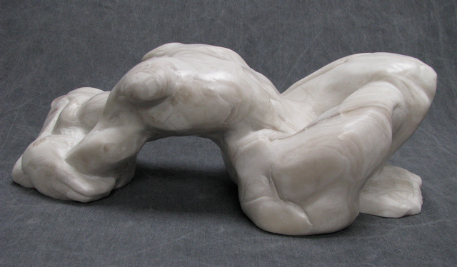 This form explores the infusion of the figure within stone. The tension of the bowed figure wraps into the arms as they pull across the face, and through the crossed legs as the feet push atop one-another. Naturally occurring lines in the stone are utilized to complement and describe the human form. This is a lengthy process of hand-carving, where I allow the stone to bring its own voice into the conversation.